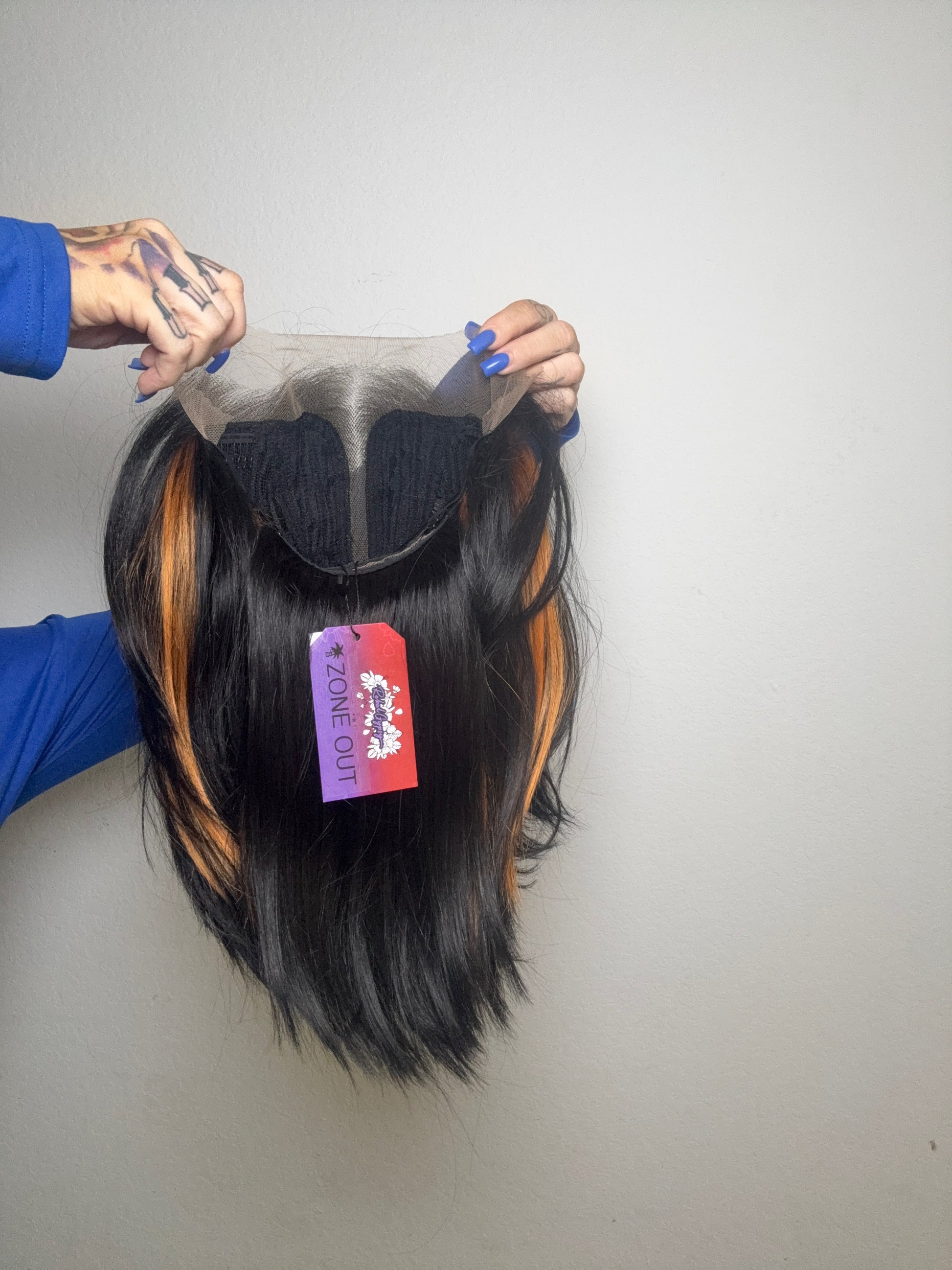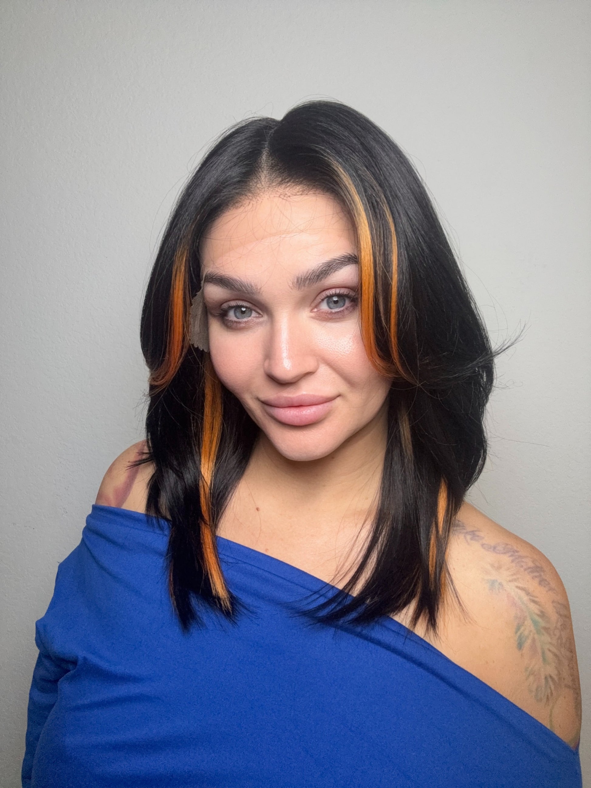 • Black wig with orange face framing pieces