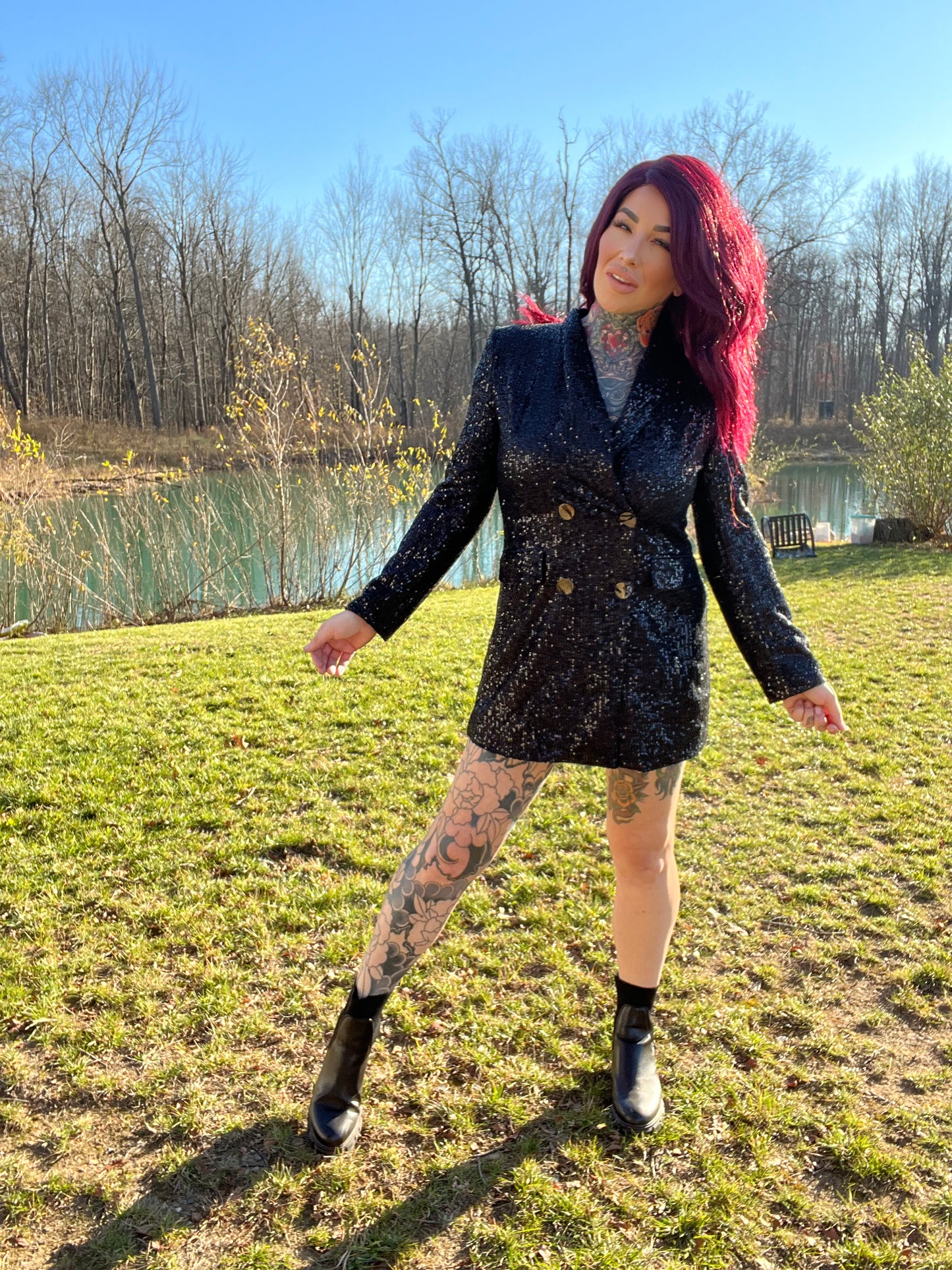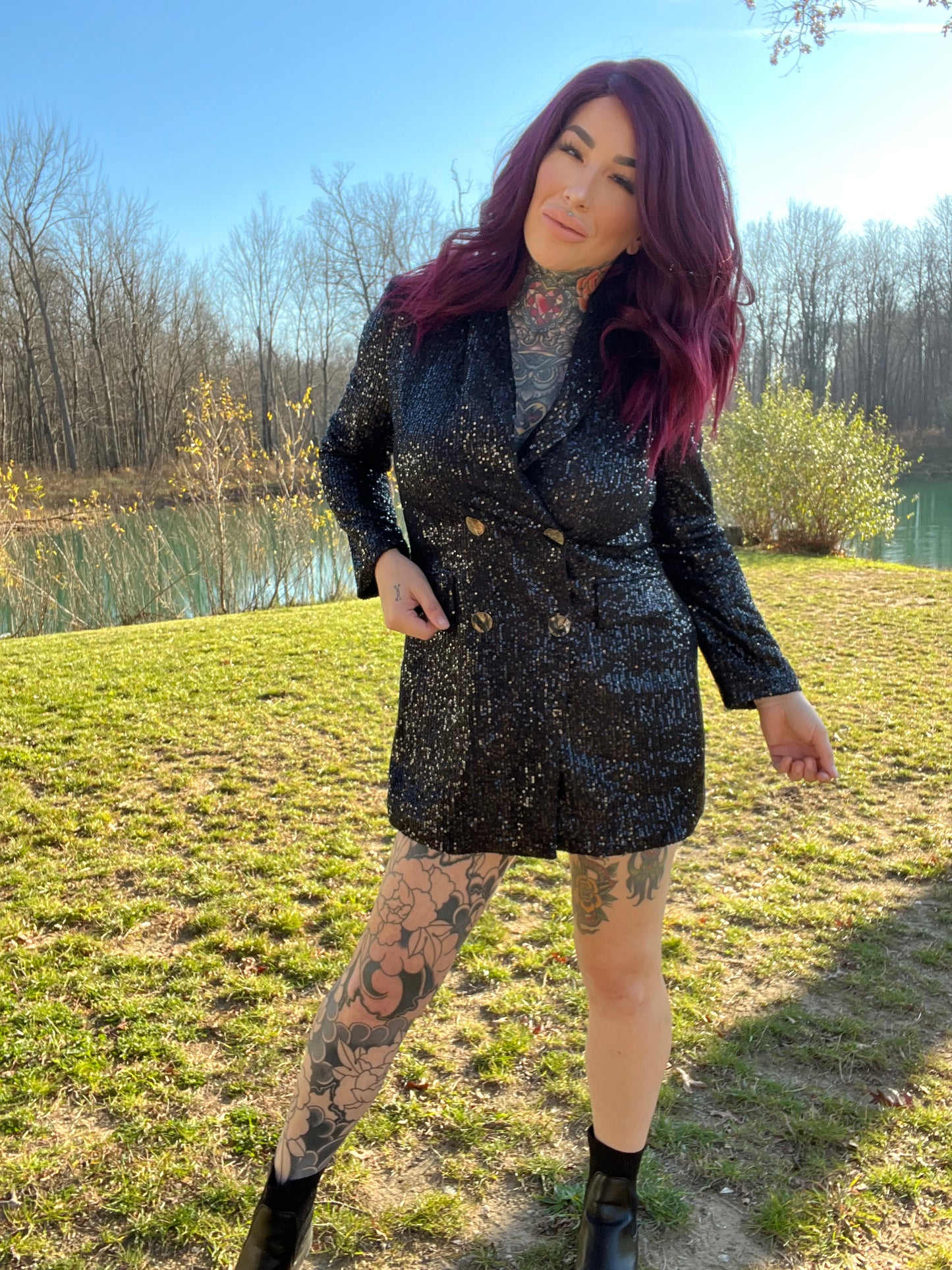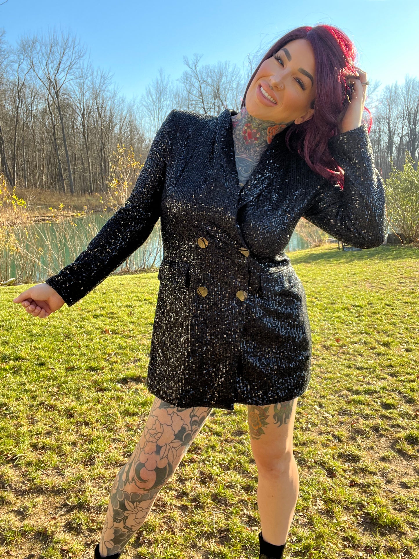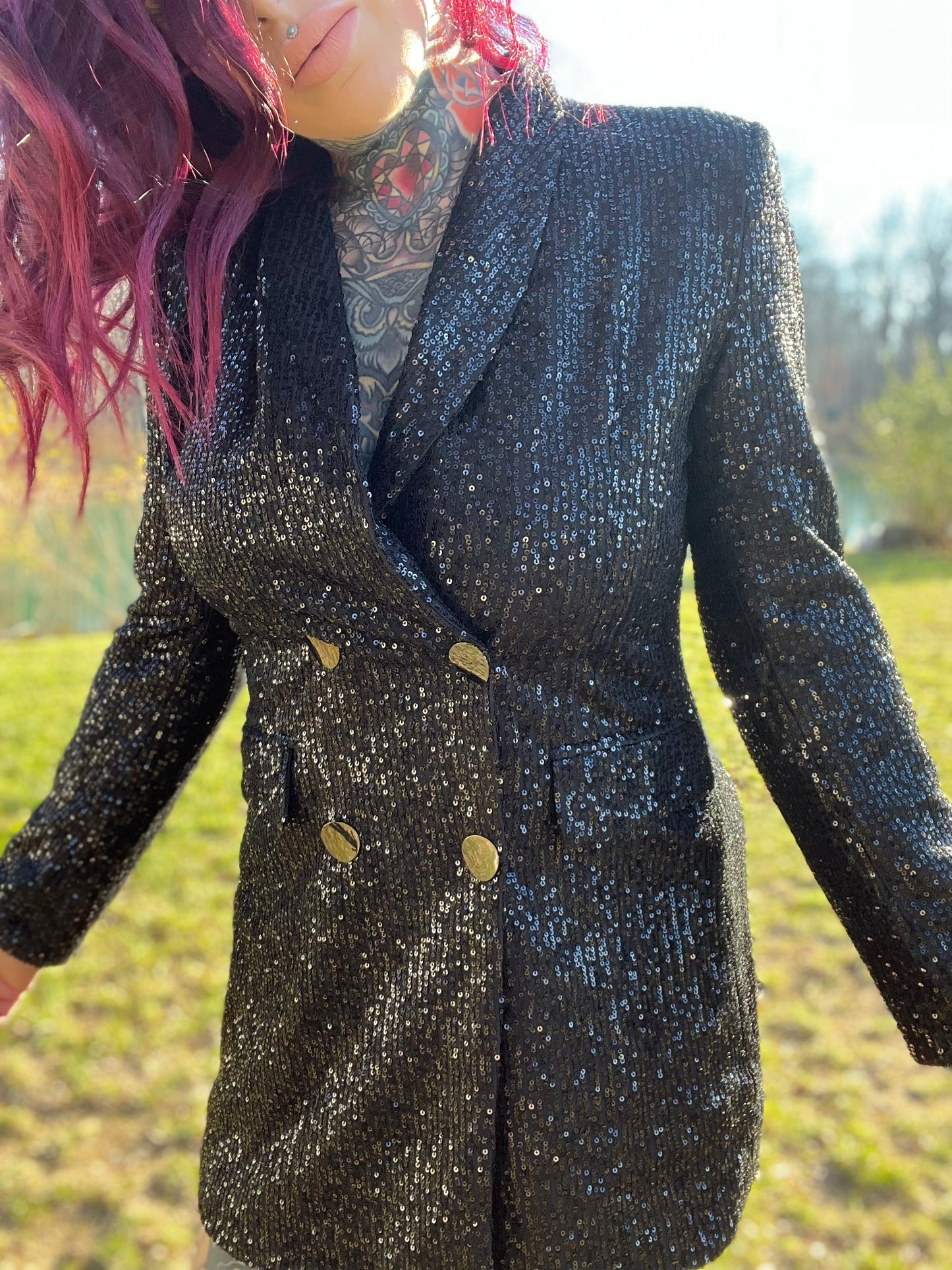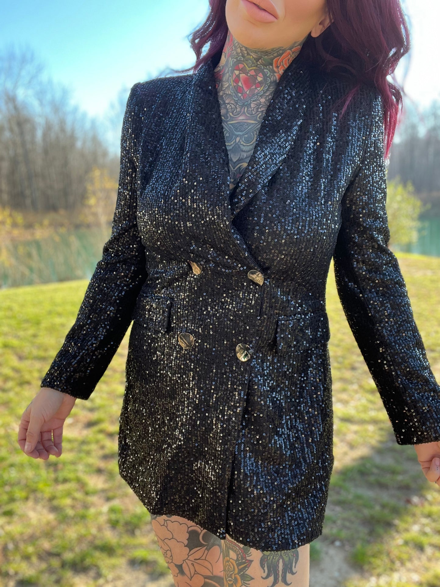 Bring the spotlight to you in our seriously sexy Always In Control sequin blazer dress!! Perfect for upcoming holiday parties or New Years Eve! Features an oversized blazer, covered in shiny sequins with functioning buttons and pockets on the front. Wear with a hat and heels for the ultimate look!! Prove to everyone that you are in control of your life! (can also be worn as just a blazer if you want!)