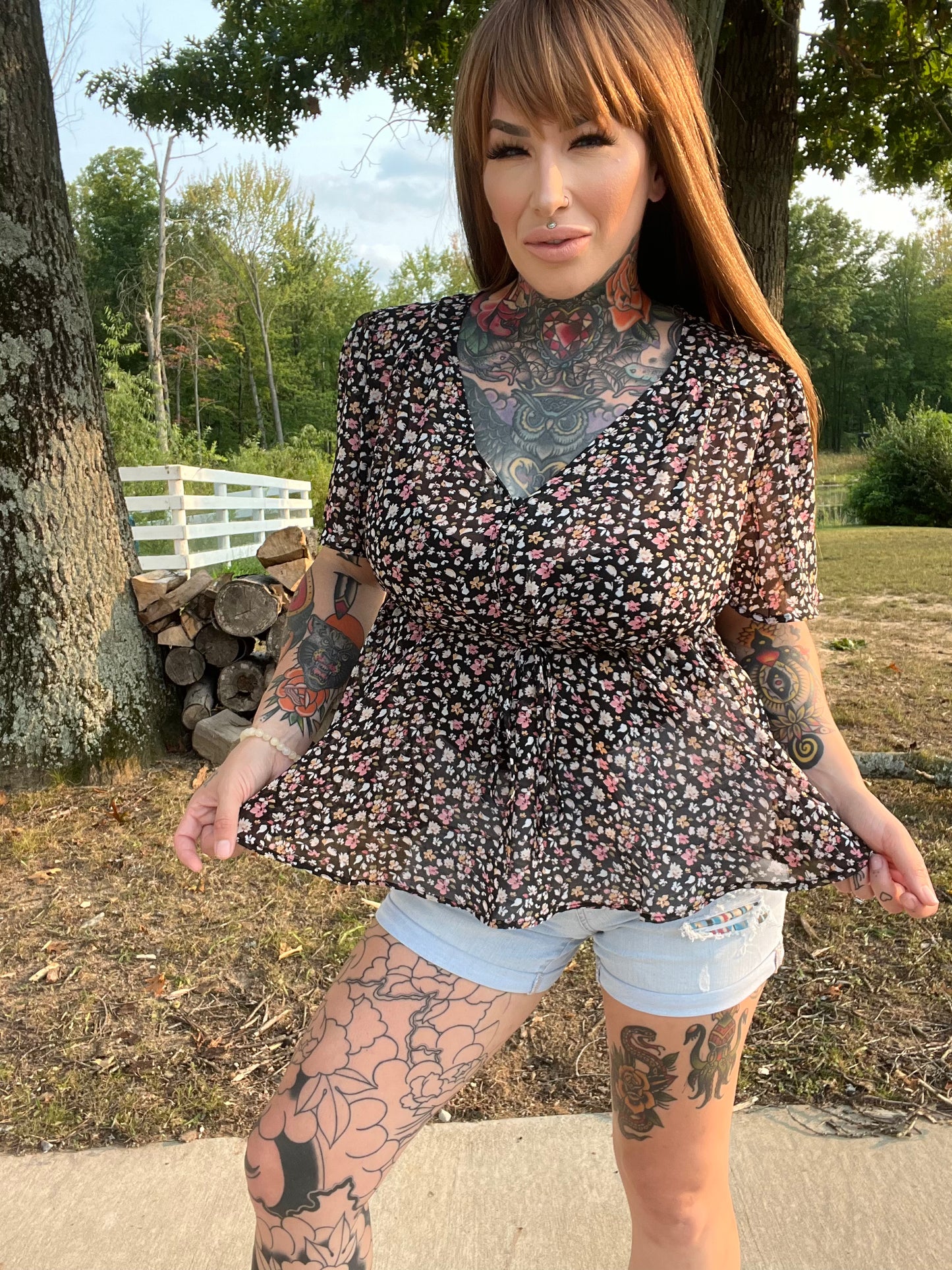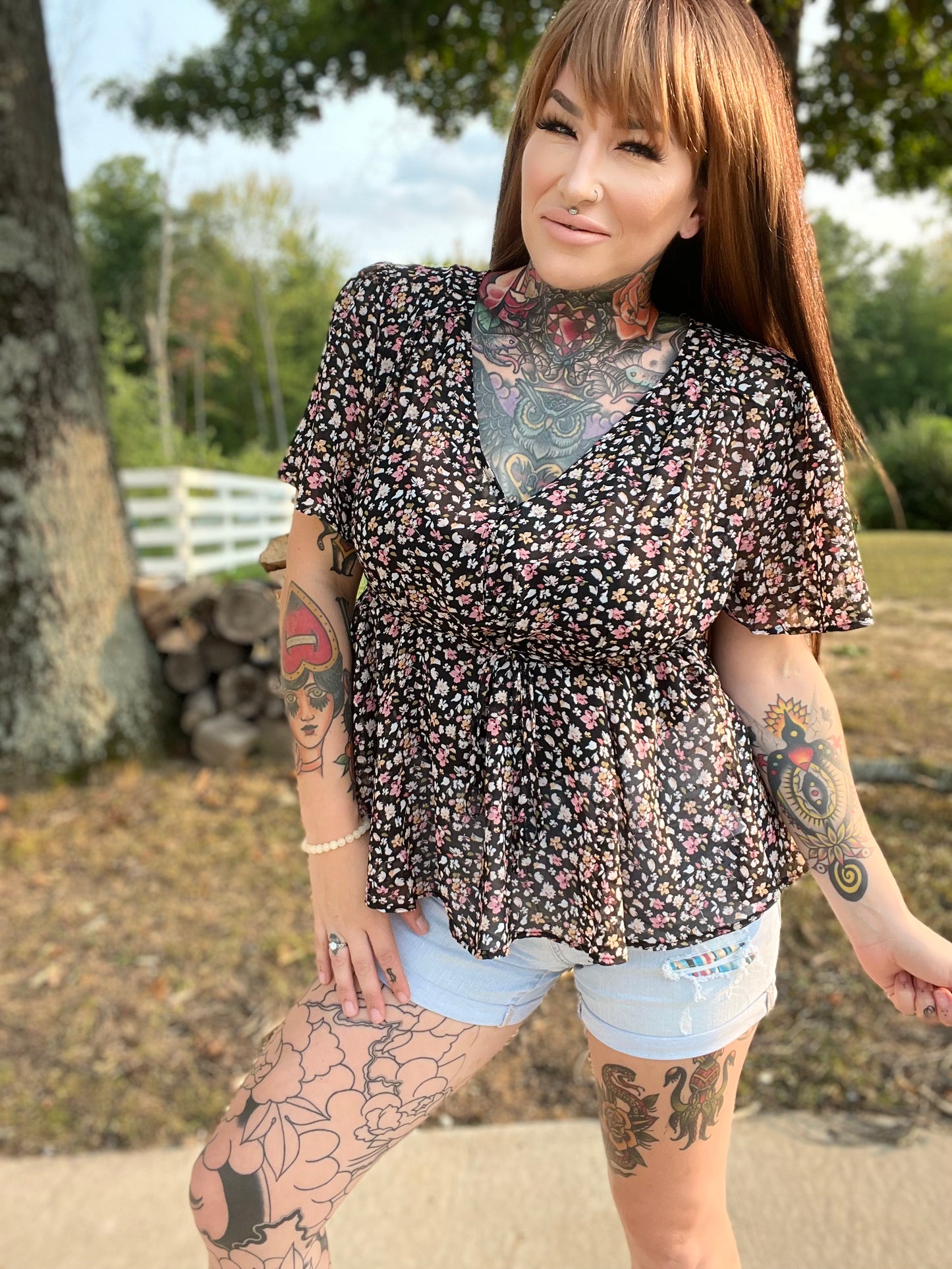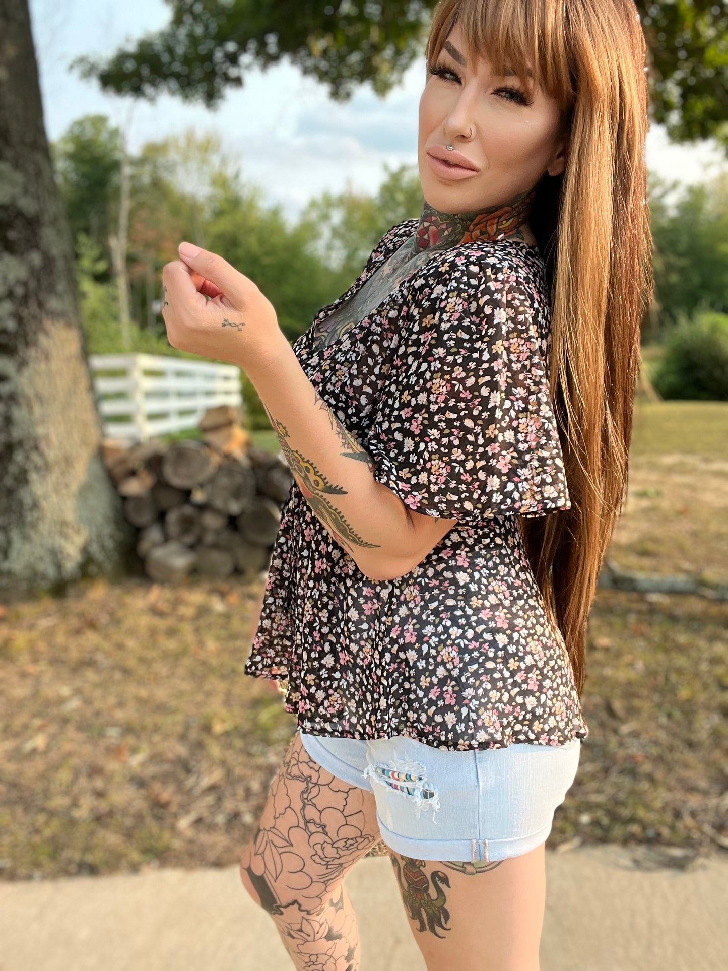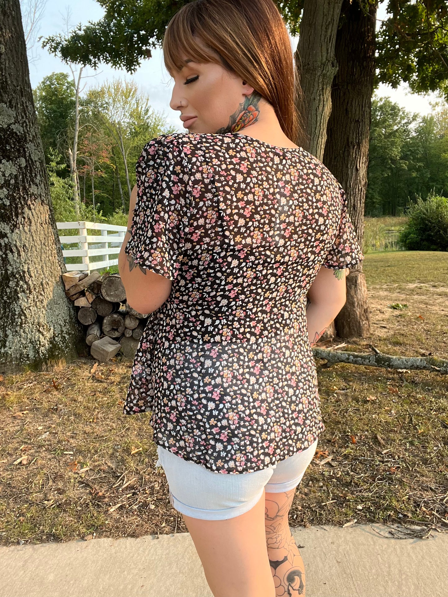 Our Autumn Flower Curvy Babydoll Top is sooo Cute!! She has a gorgeous floral print and made out of a super lightweight sheer material. She features a 3 button down middle top portion with functioning buttons, and a back tie for a fitted waist. This beautiful top can be dressed up or down for any occasion and will look great paired with any jeans and booties.