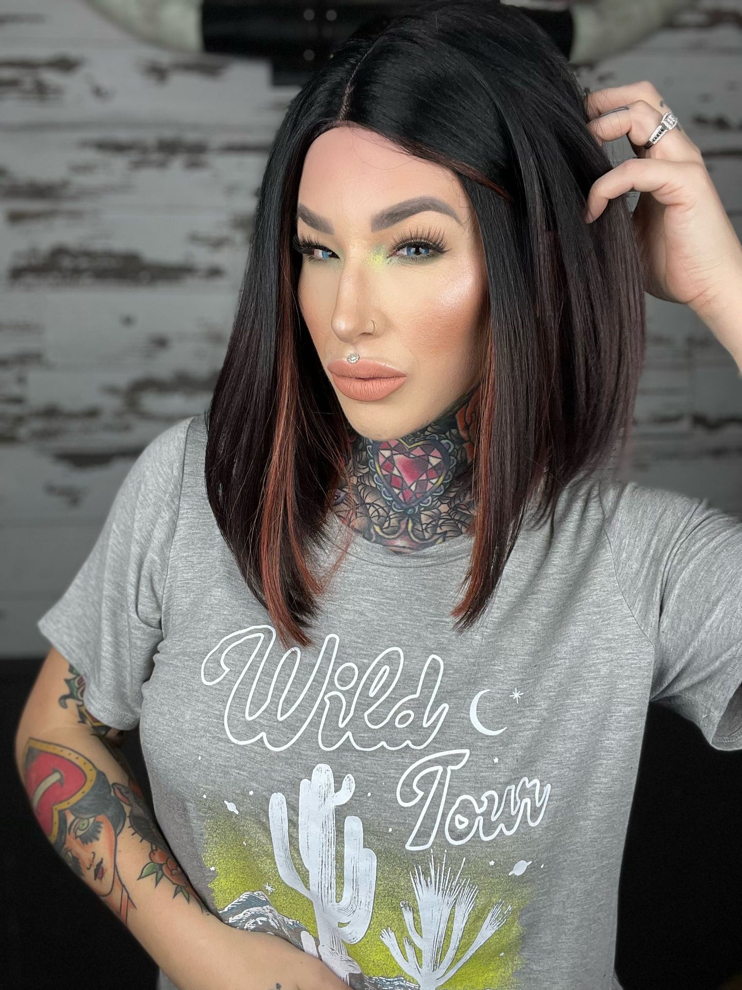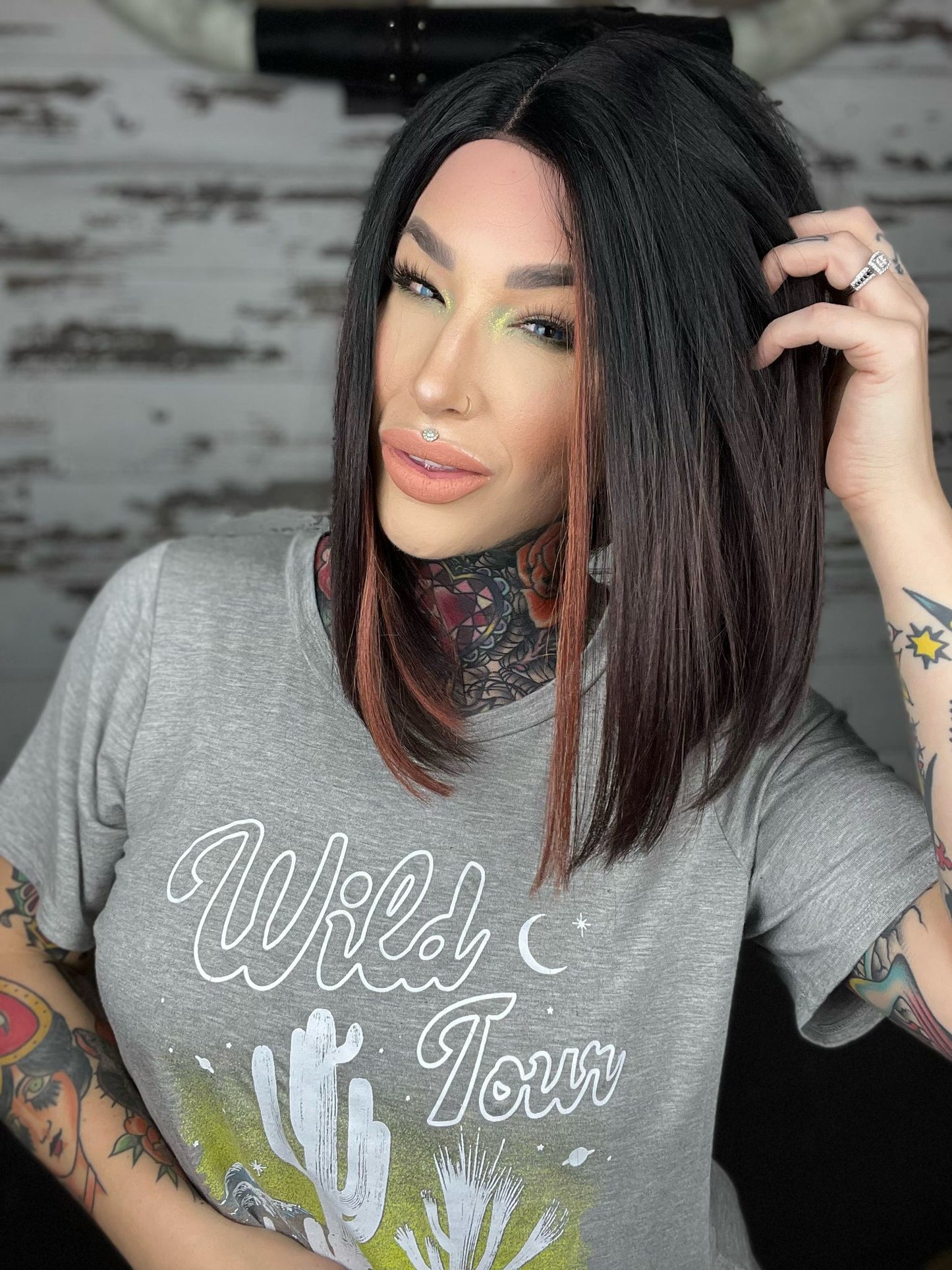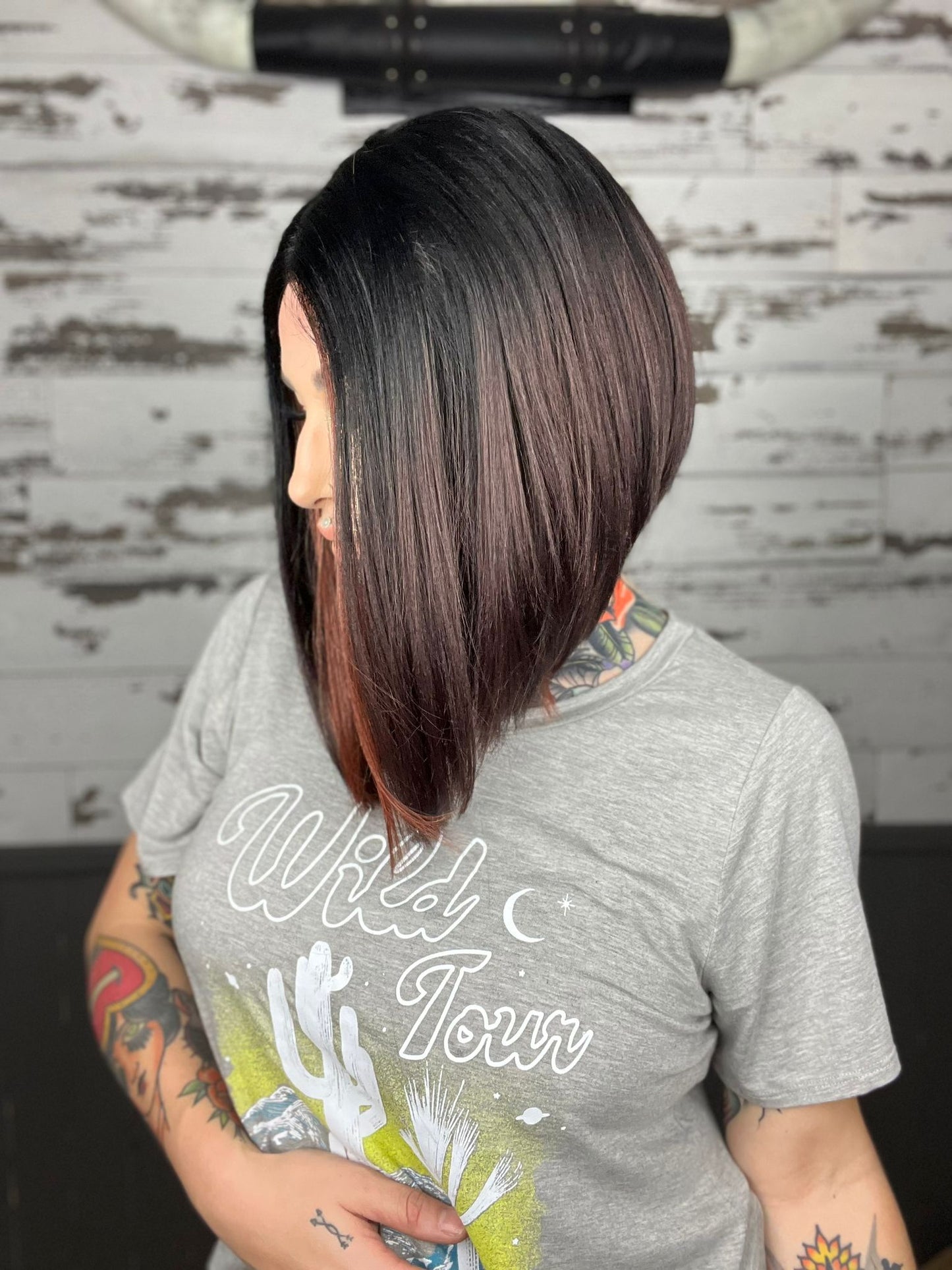 • Black wig ombré to burgundy with copper money pieces