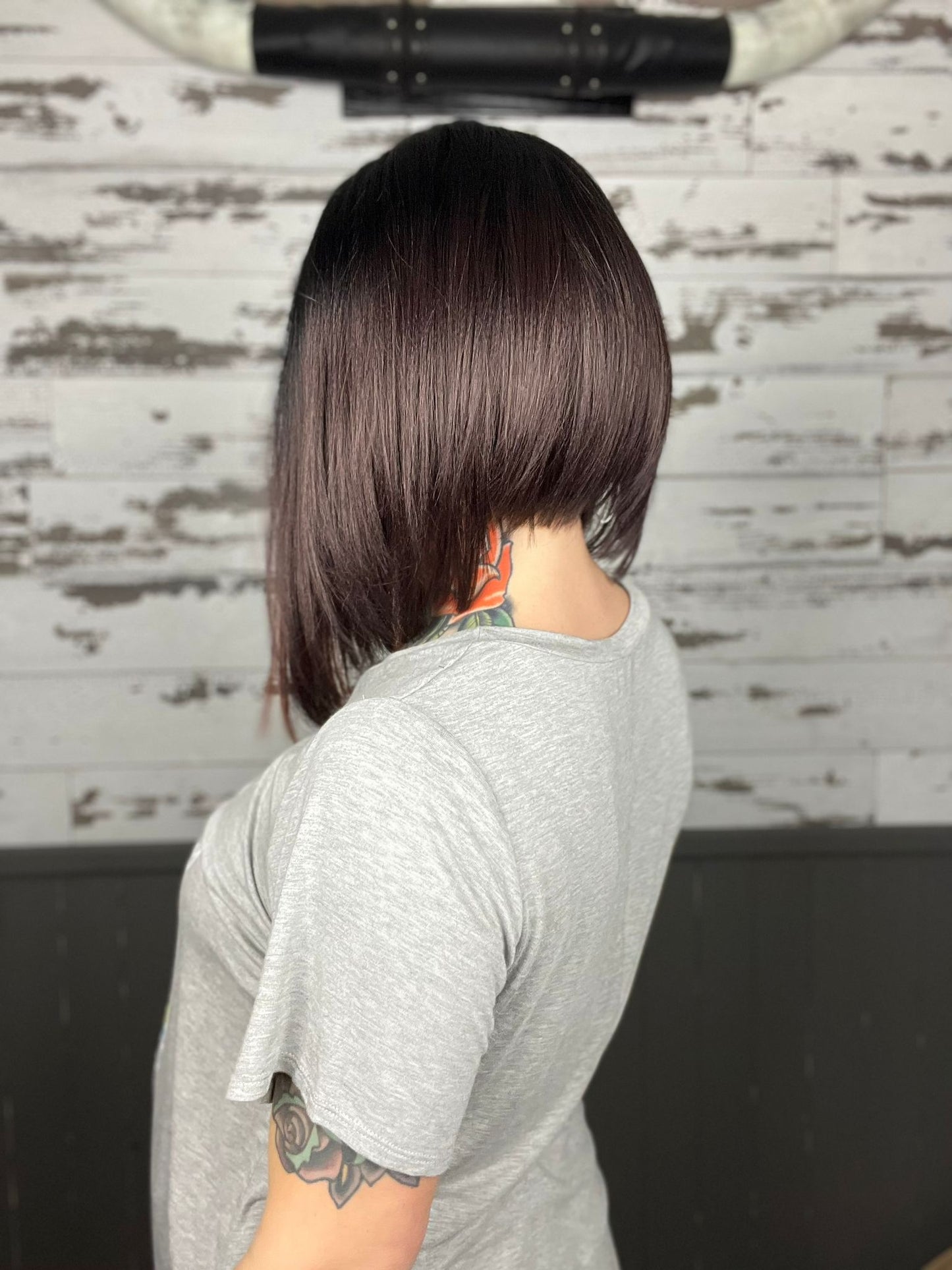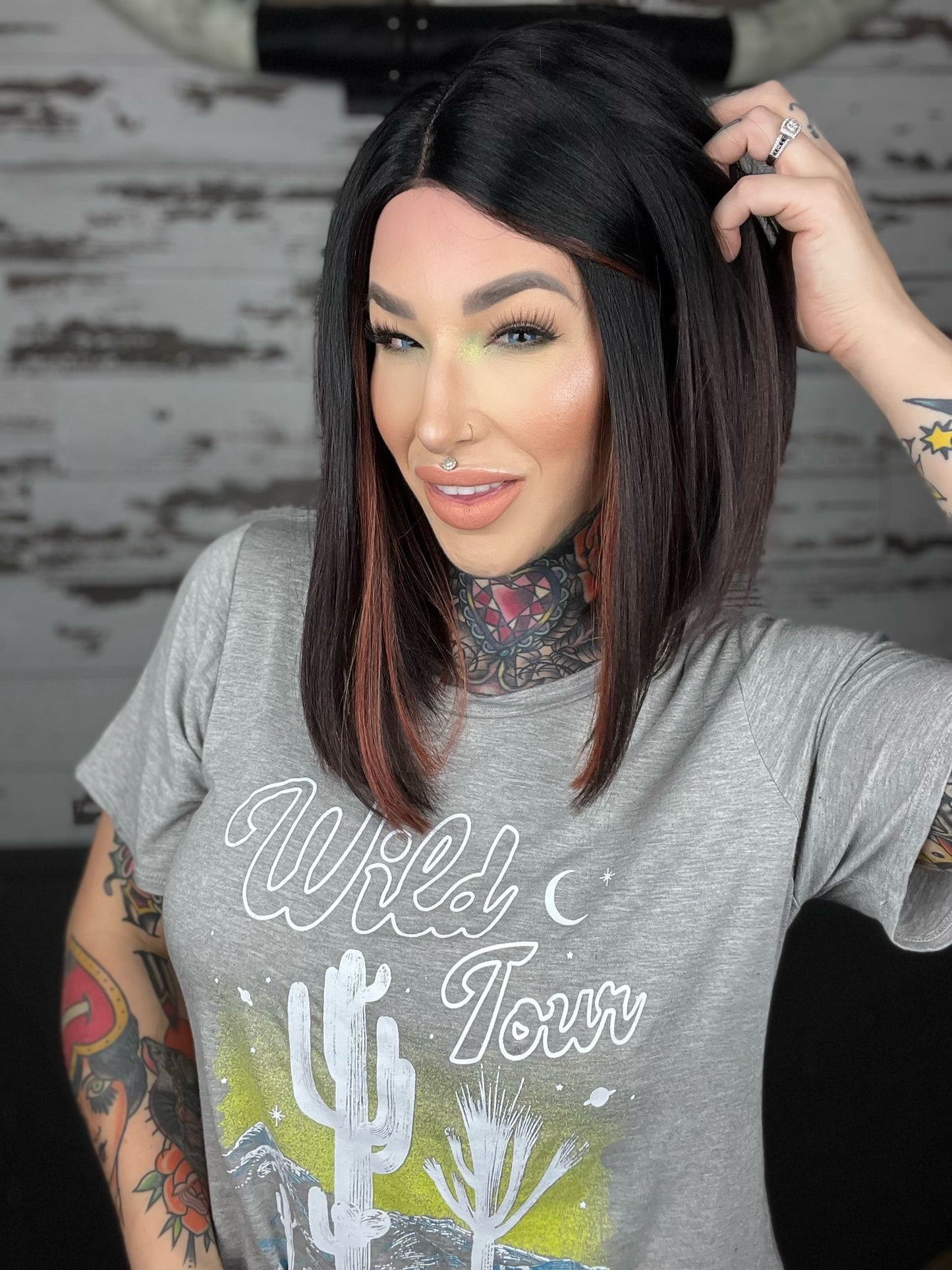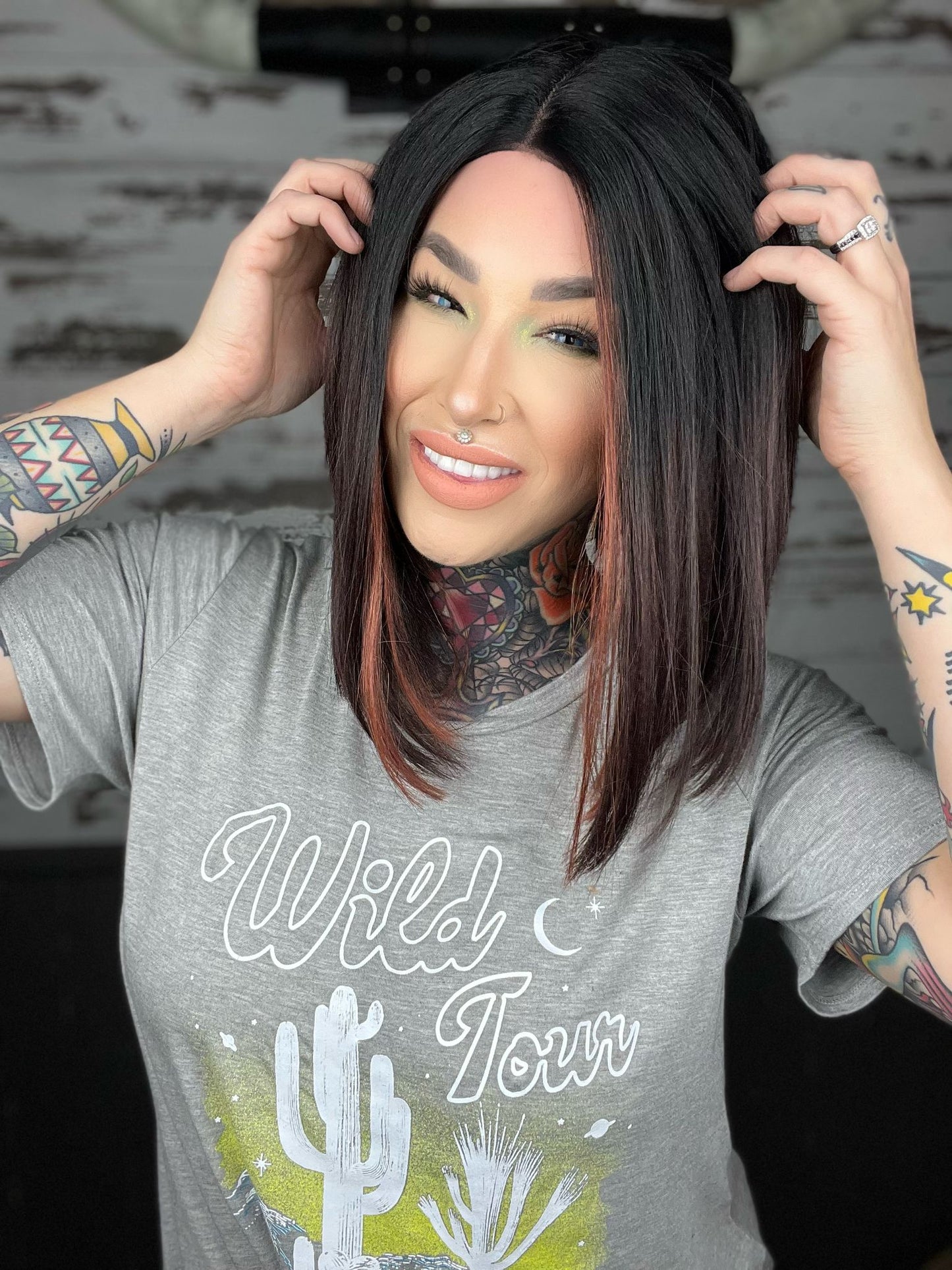 • Black wig ombré to burgundy with copper money pieces