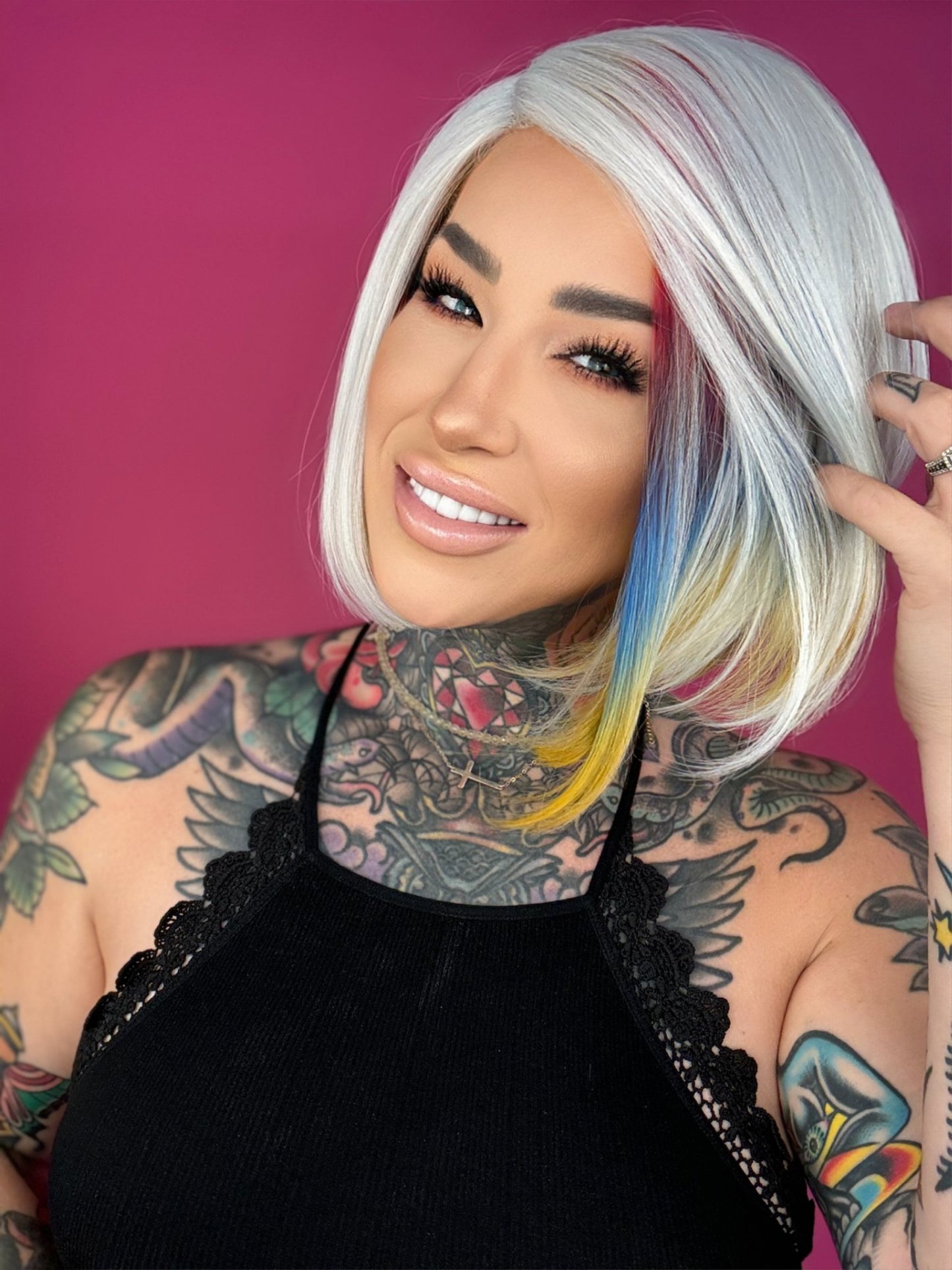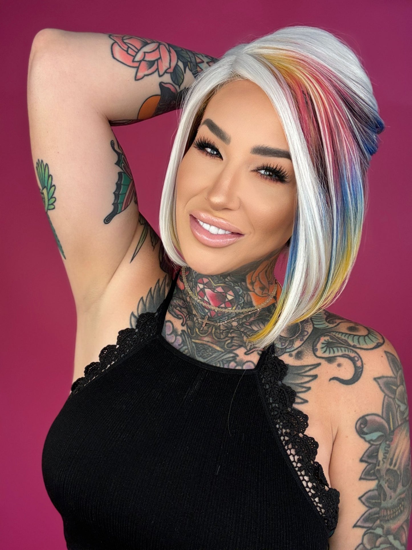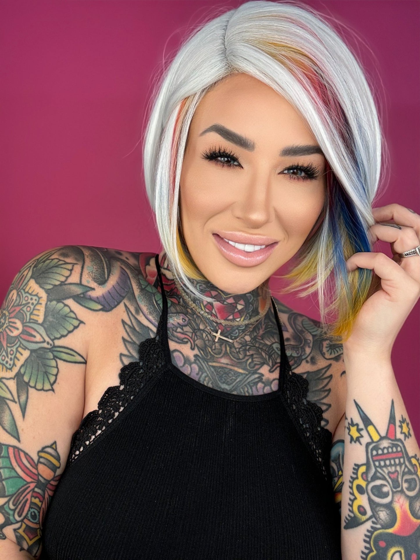 • Silver wig with rainbow colors throughout