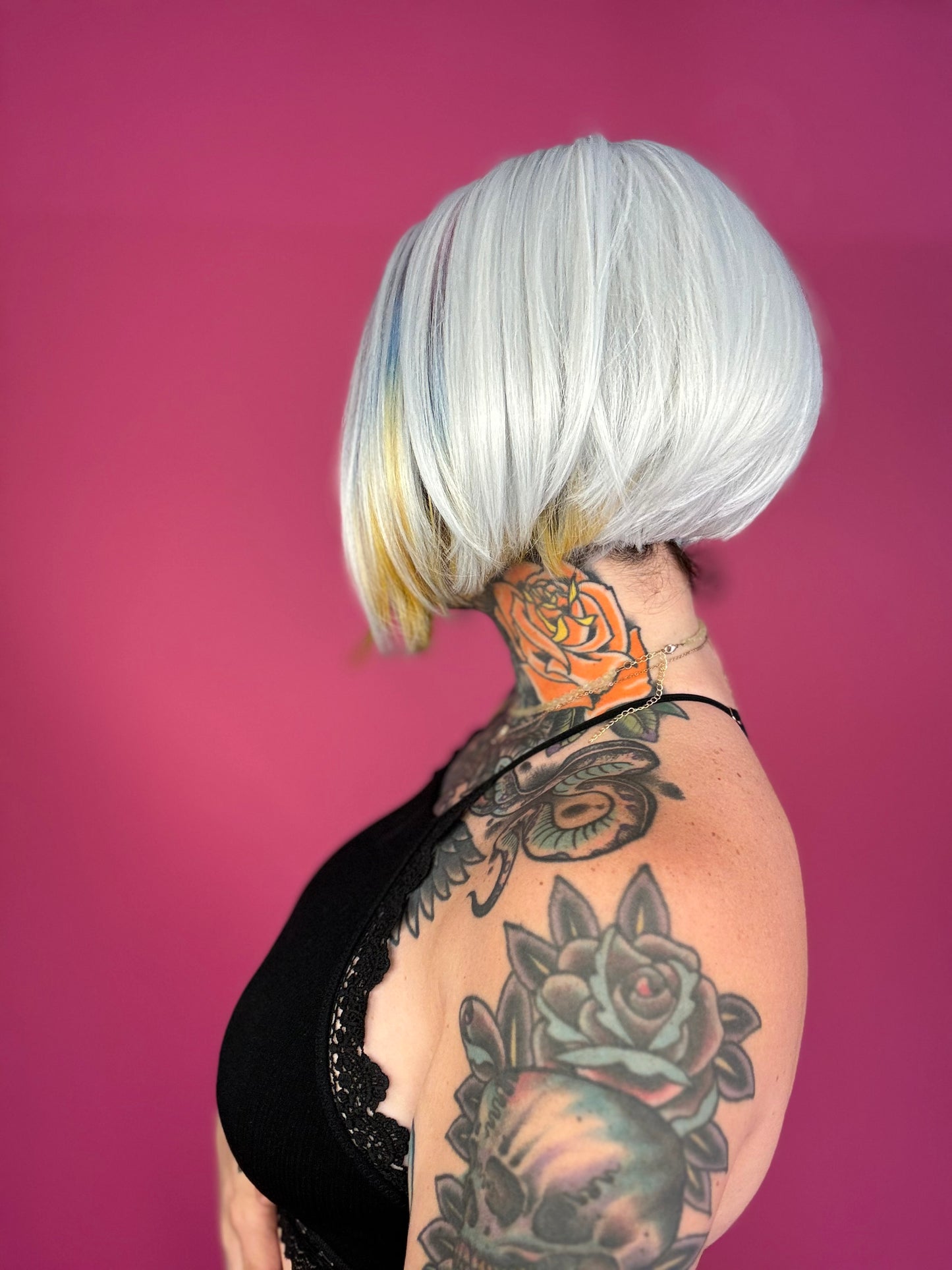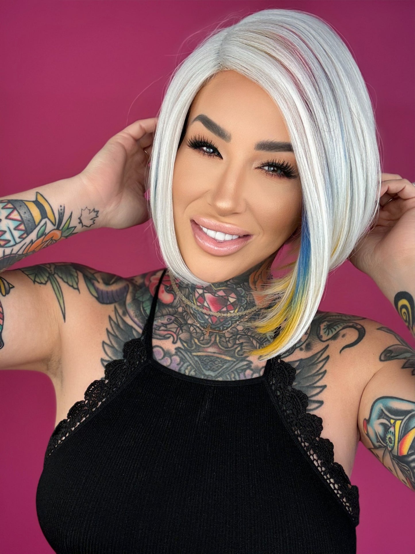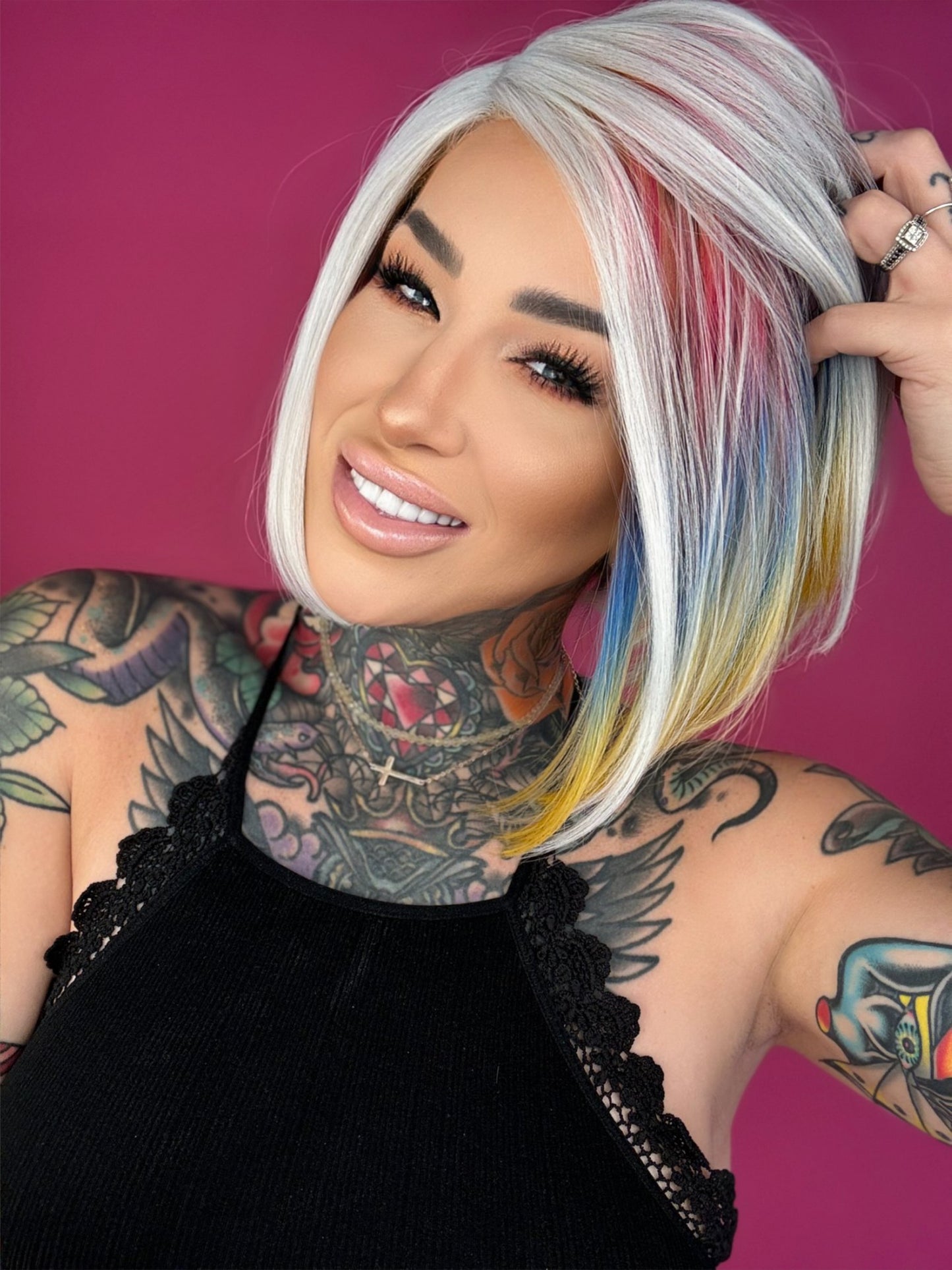• Silver wig with rainbow colors throughout