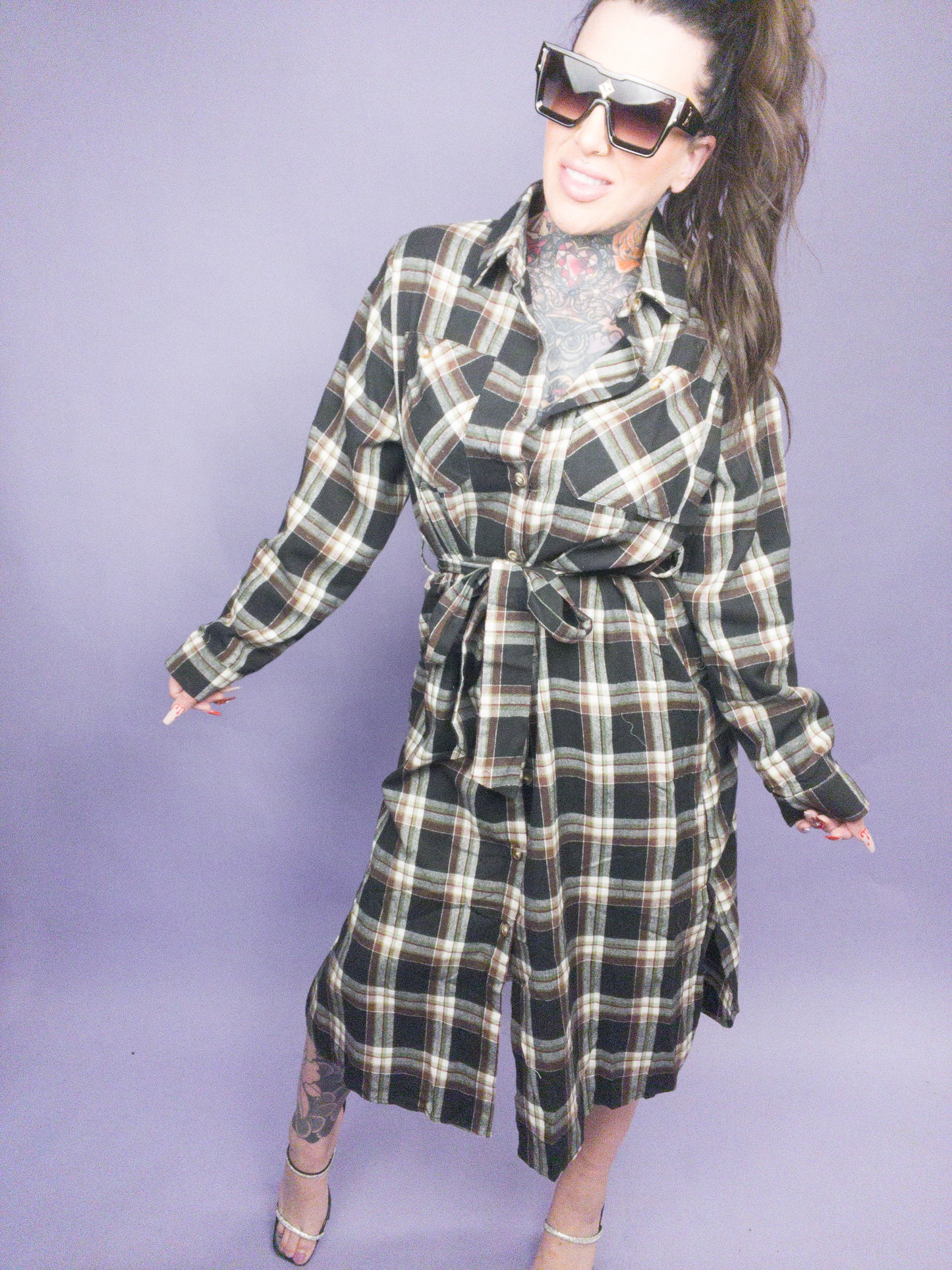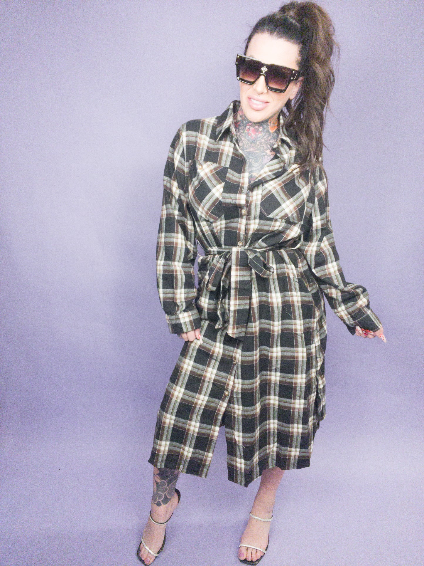 PLAID PRINT COLLAR LONG SHIRT DRESS